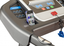 - Дополнительные особенности тренажера Круглая кнопка на консоли, кнопки управления на поручнях (скорость и наклон), двухфазная гидравлика Easy Drop™ для плавного опускания беговой поверхности, отсеки для аксессуаров