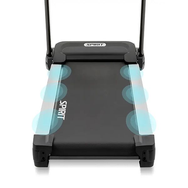 - Амортизация бегового полотна, состоящая из 6 полиуретановых эластомеров, эффективно поглощает ударную нагрузку, снижая риск возникновения травмы;