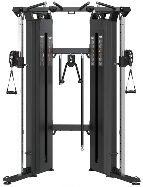 Данный кроссовер относится к моделям профессионального класса и предназначен для коммерческого использования. Функциональные упражнения, выполняемые с помощью этого тренажера, обеспечивают эффективную проработку различных мышечных групп. Двойные тяговые колонны позволяют выполнять упражнения как двумя руками, так и одной, что обеспечивает возможность прорабатывать необходимые группы мышц. Вращающиеся рукояти обеспечивают свободные и естественные движения. На верхней перекладине предусмотрен турник, рукоятки которого позволяют выполнять подтягивания Широким, нейтральным и узким хватом, что позволяет прорабатывать различные группы мышц, акцентируя на них нагрузку. Конструкция кроссовера включает 2 грузовых стека. Удобный выбор нагрузки осуществляется с помощью штифтов.