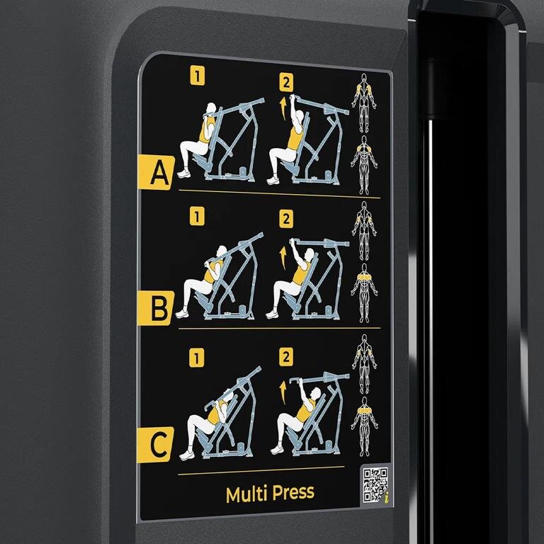 - Инструктивные таблички Обозначения мышц, иллюстрации начала и завершения упражнений, правильные движения на тренажере, QR-код со ссылкой на обучающие видео