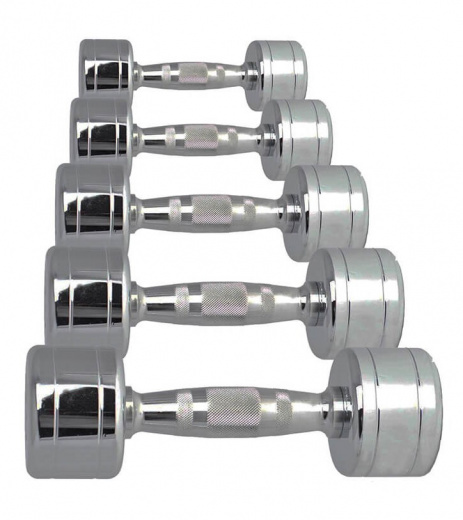 Профессиональный комплект хромированных гантелей с диапазоном от 1 до 10 кг, включающий 10 пар с шагом в 1 кг.