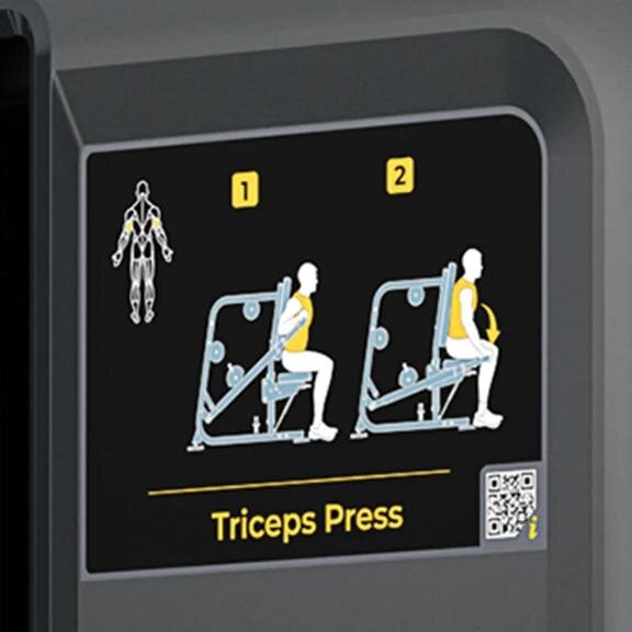 - Инструктивные таблички Обозначения мышц, иллюстрации начала и завершения упражнений, правильные движения на тренажере, QR-код со ссылкой на обучающие видео