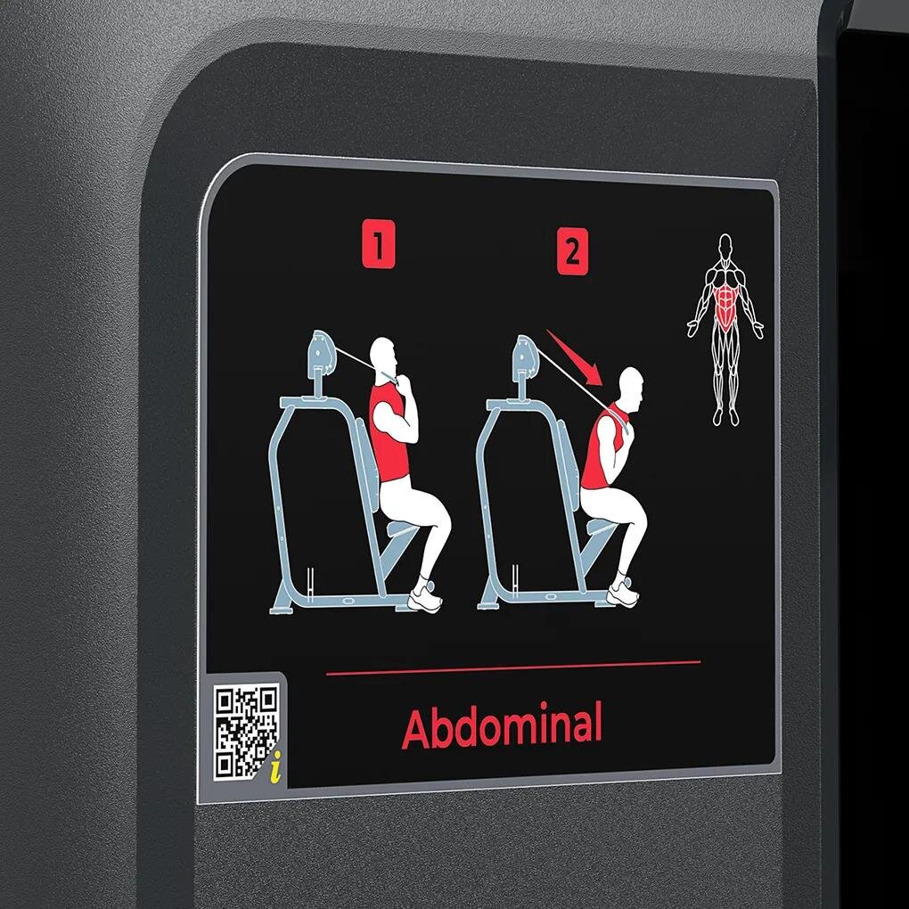 - Инструктивные таблички Обозначения мышц, иллюстрации начала и завершения упражнений, правильные движения на тренажере, QR-код со ссылкой на обучающие видео