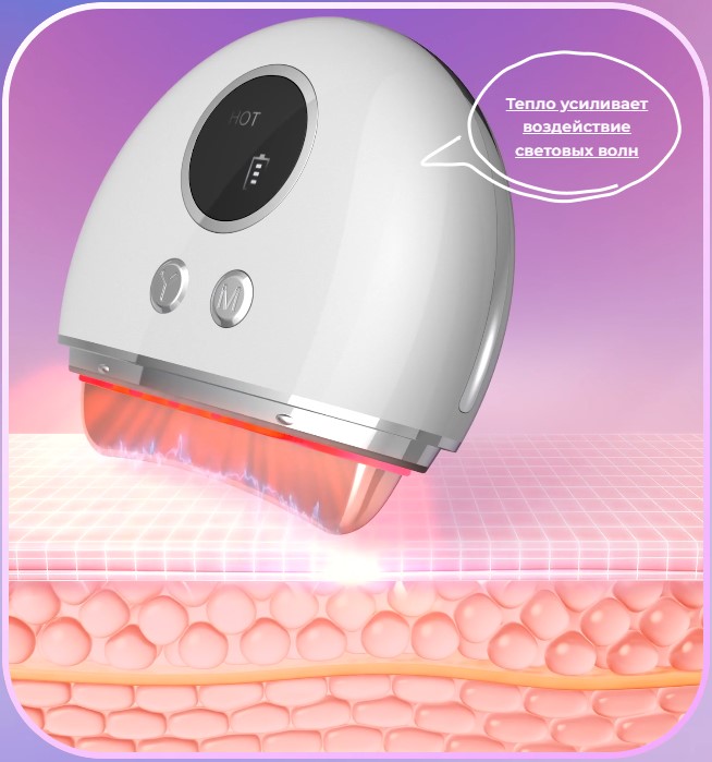 Изгиб рабочей грани прибора имитирует скребковую технику массажа — она эффективно устраняет токсины, улучшает лимфоток и усиливает абсорбцию питательных веществ.