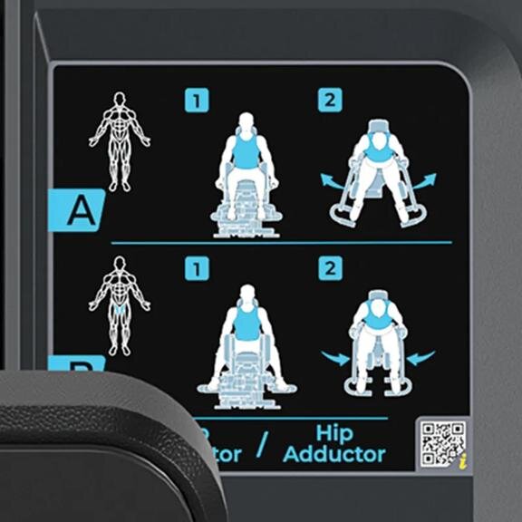- Инструктивные таблички Обозначения мышц, иллюстрации начала и завершения упражнений, правильные движения на тренажере, QR-код со ссылкой на обучающие видео