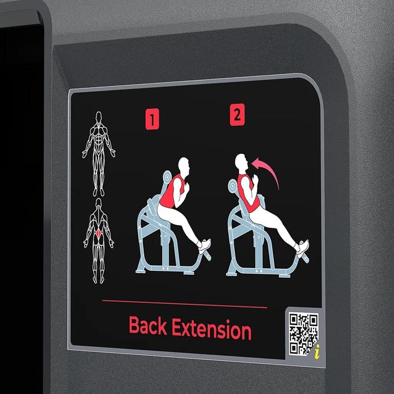 - Инструктивные таблички Обозначения мышц, иллюстрации начала и завершения упражнений, правильные движения на тренажере, QR-код со ссылкой на обучающие видео