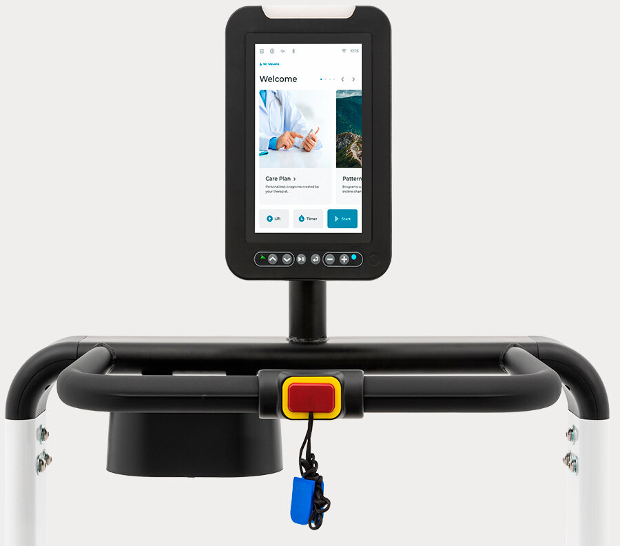 Умная консоль с сенсорным экраном, Bluetooth, Wi-Fi и облачным хранением данных. Держатель консоли позволяет поворачивать монитор на 360 градусов для удобства администратора. В верхней части - световой индикатор, который изменяет цвет в зависимости от показателей состояния пользователя, помогая врачу контролировать тренировку даже дистанционно. На мониторе отображаются данные тренировок: симметрия шага, кардионагрузка, тесты VO₂ max и многое другое. Имеется несколько способов входа в личный кабинет пользователя: NFC, QR-код или PIN-код для удобства медперсонала. Вы получаете полный контроль над реабилитацией: от составления плана тренировок до анализа эффективности занятий. Информация для врача под рукой. Аналитика и неотложная коррекция нагрузки.