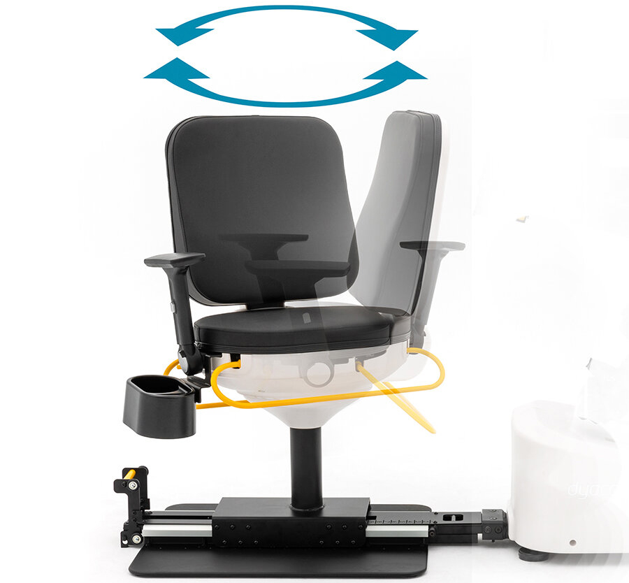 Сиденье настраивается вперед/назад, поворачивается на 180 градусов на обе стороны, спинка откидывается назад на 45 градус для разгрузки тазобедренных суставов. Подлокотники складываются, предоставляя доступ для трансфера маломобильных пользователей. Съемное сиденье легко снимается для доступа кресла-коляски.
