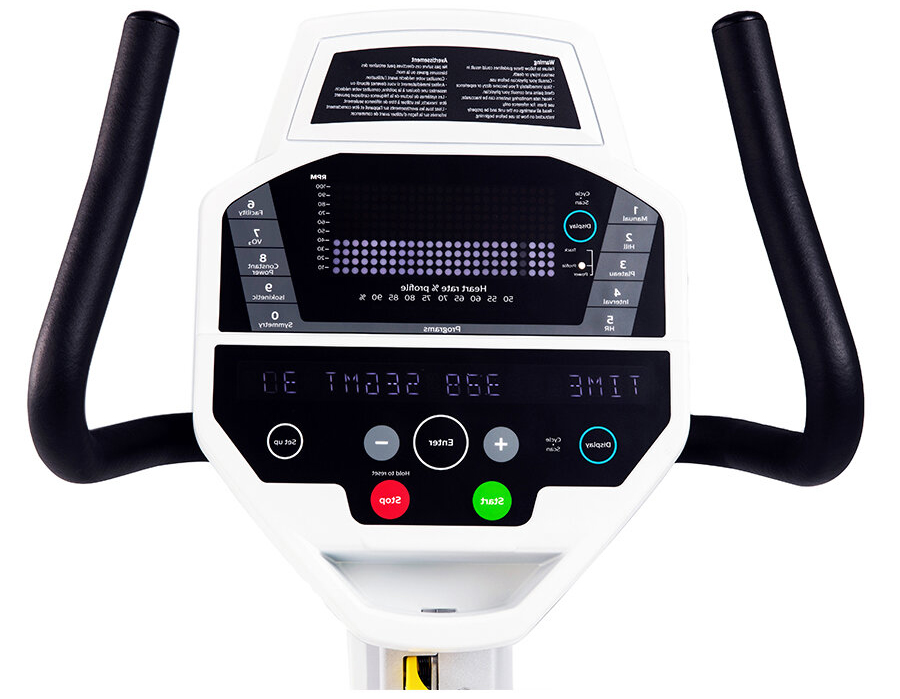 На большом светодиодном экране отображается статистика тренировки: время, количество оборотов в минуту, калории, частота сердечных сокращений и мощность, метаболического эквивалента (MET) и мощности (Watt).