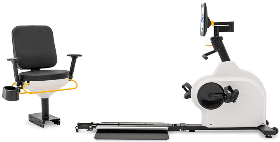 Тренажер оборудован сиденьем, которое поворачивается на 180 градусов в обоих направлениях, отклоняется на 45 градусов в полулежачее положение для разгрузки тазобедренных суставов. Можно полностью снять сиденье для тренировки на кресле-коляске: