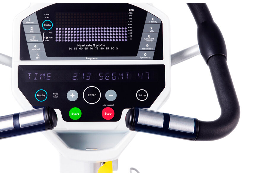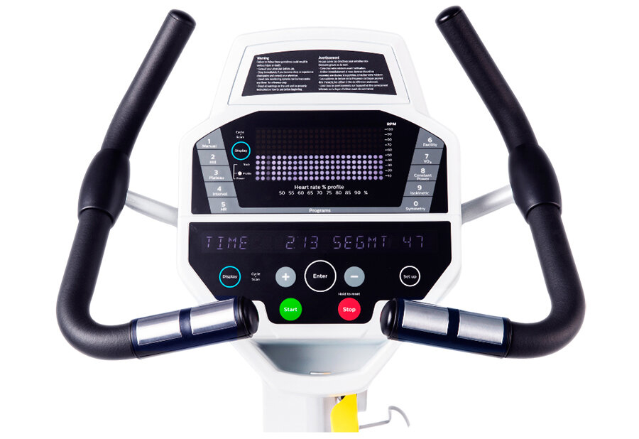 - Общее количество программ Manual, Hill Plateau, Interval profiles, VO2, HR, Custom, Isokinetic speed-based resistance (from 25 to 100 RPM), Symmetry
