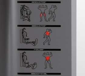 - Упражнения Жим от груди и от плеч, баттерфляй, верхняя и нижняя тяги, пресс-спина, разгибание, отведение и приведение ног