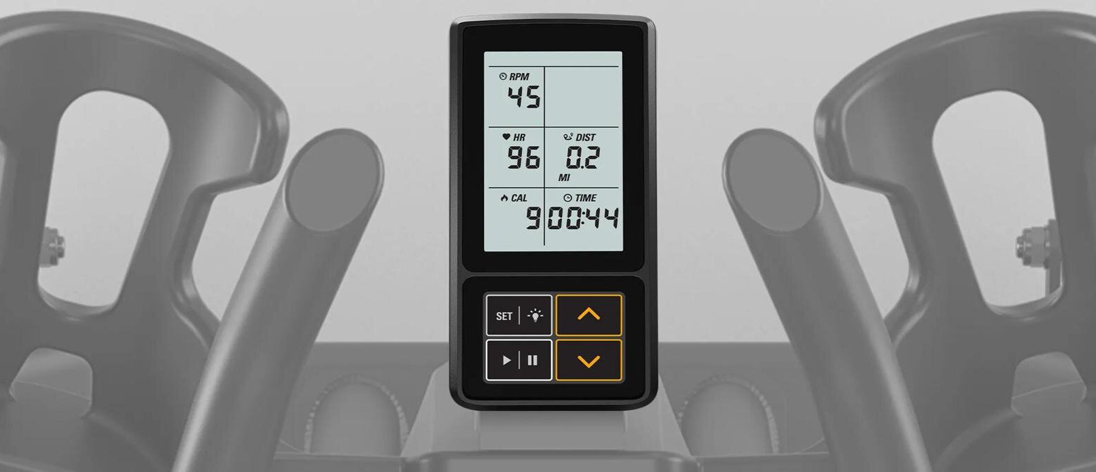 Дайте возможность каждому спортсмену отслеживать свои цели на дополнительной ЖК-консоли, которая четко отображает обороты, расстояние, калории, время и частоту сердечных сокращений при использовании с пульсометром ANT+/5 кГц (консоль устанавливается на место держателя для персональных устройств, имеющегося в базовой модели).