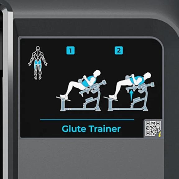 - Инструктивные таблички Обозначения мышц, иллюстрации начала и завершения упражнений, правильные движения на тренажере, QR-код со ссылкой на обучающие видео